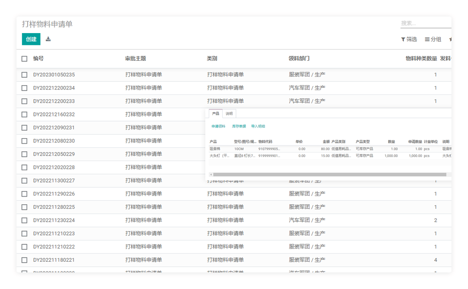 用于查看销售口下推下来的打样申请单。总装打样部门相关人员