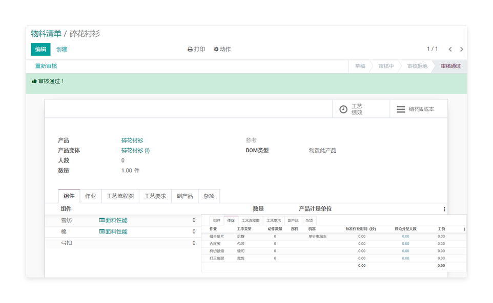 添加生产该部件所用到的物料,以及裁剪、缝纫、后整、包装环节要做的工序作业。