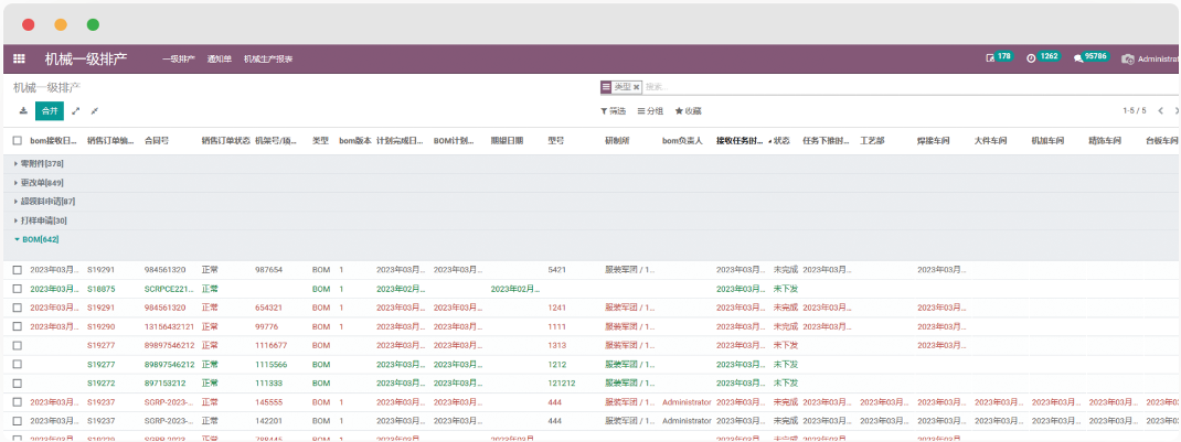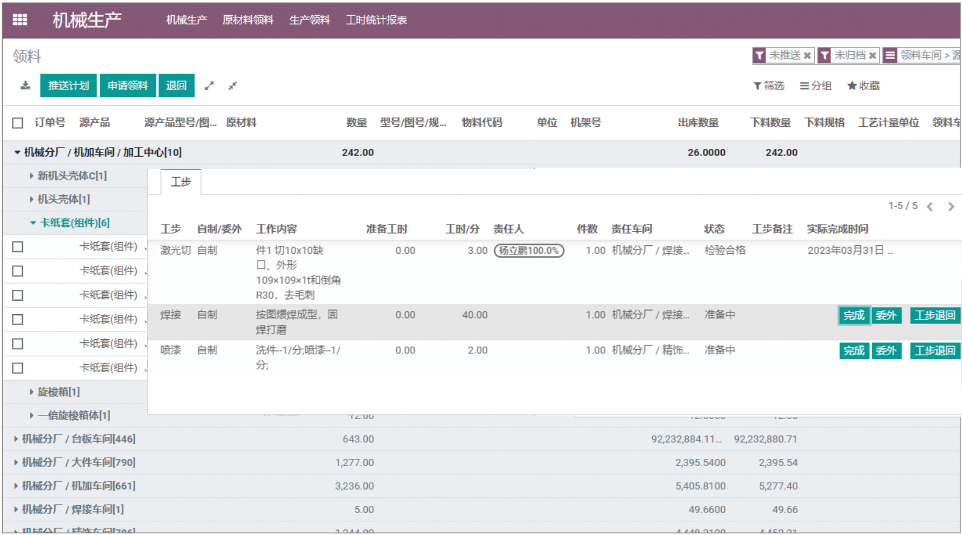 机械主要包括一级排产、二级排产、三级排产、机械生产等四个模块,用于接收研制所、配套等部门下发的生产任务为各部门生产所需物料的工作,保质保量为各部门生产所需要的物料。