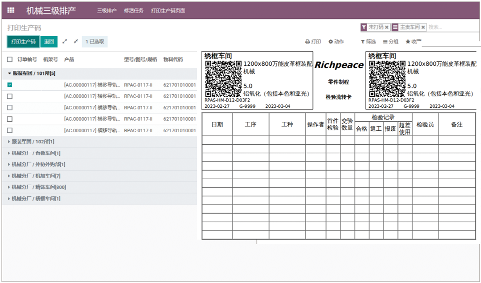 生产任务查看,各车间主任及时掌握本车间的生产进度通过权限进行控制以及每个任务生产码的打印,通过二维码可以快速定位当前生产任务的详细情况。
